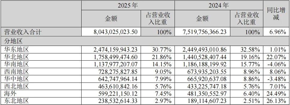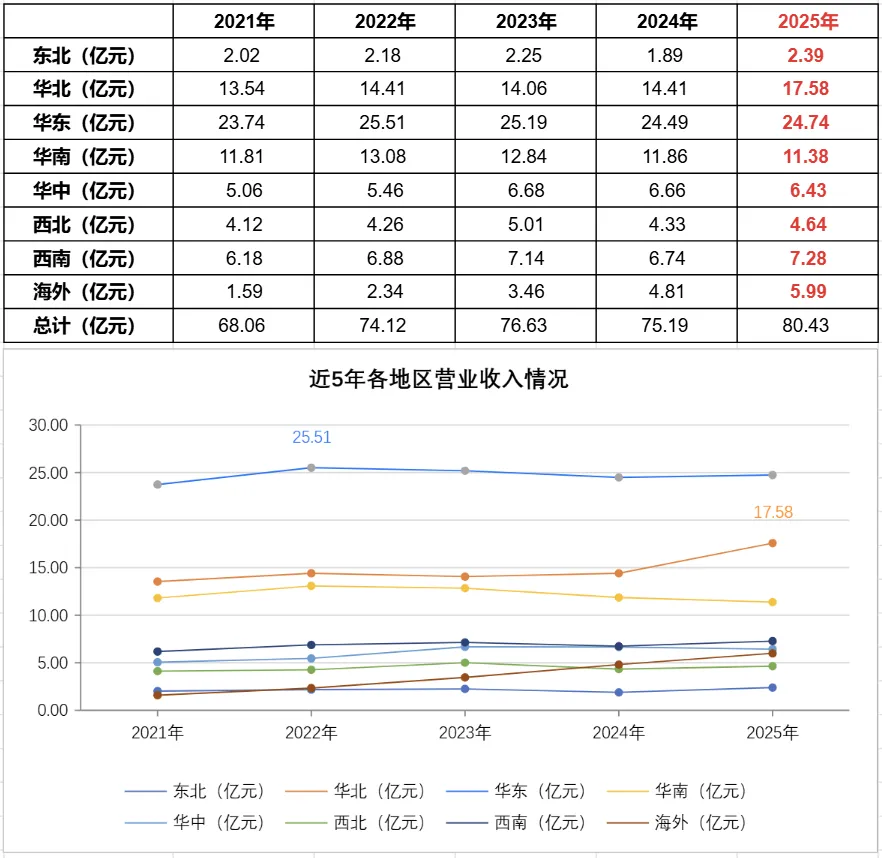 营业收入主要来自华东、华北及华南地区,海外业务每年都在增长。