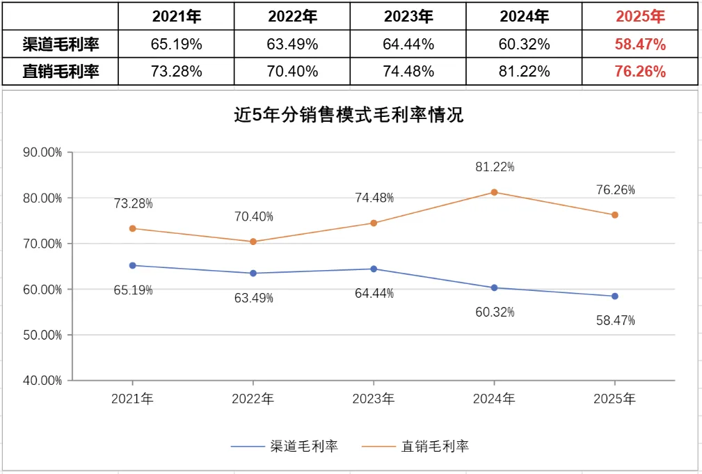 直销毛利率较高,渠道毛利率下降,需要让利给渠道增加营收。