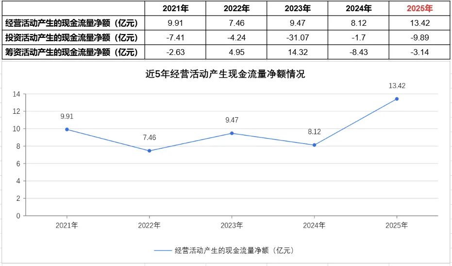 经营活动产生的现金流正常,2025年创新高,投资和筹资活动正常,2025年加大了投资力度。