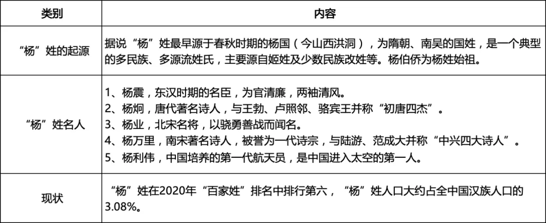 四、研究结论1. 资料显示,“杨”姓最早源于春秋,是隋朝、南吴的国姓,是一个典型的多民族、多源流姓氏。2. “杨”姓名人辈出,有名臣杨震,有著名诗人杨炯、杨万里,有名将杨业,有中国第一位进入太空的航天员杨利伟……他们在各个领域都闪耀着光芒。3. “杨”姓不是全国人口最多的姓氏,在2020年“百家姓”排名中排行第六。