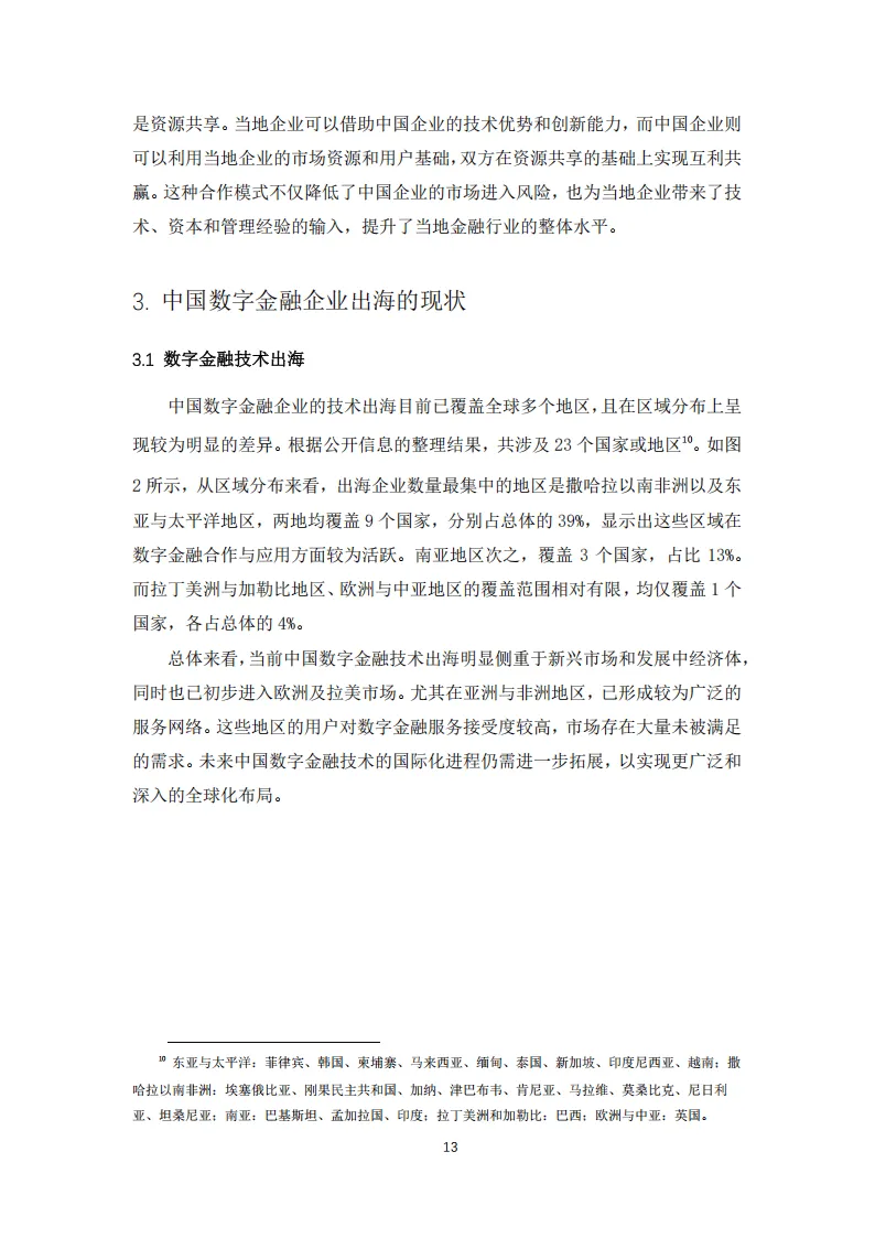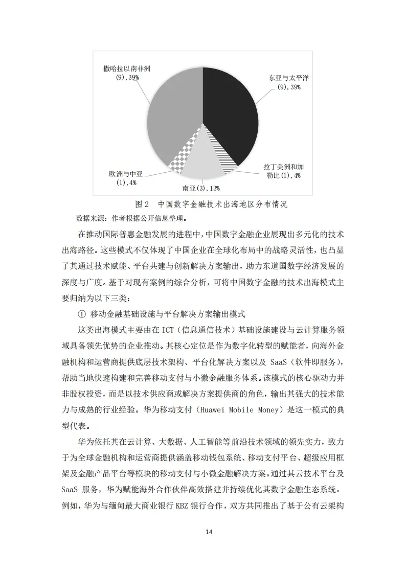 这份2025年中国数字金融出海的国际普惠效应报告,系统分析了中国数字金融出海的发展特征、实际成效、面临挑战并提出相关建议。报告指出,2012年以来中国数字金融出海在技术和服务领域均表现突出,金融科技公司增速最快,银行次之,非银金融机构增速最小。技术出海形成基础设施与解决方案输出、股权投资与技术赋能、前沿支付技术创新输出三大模式,出海区域集中在东南亚、欧洲和中亚、撒哈拉以南非洲,且在中上、中低收入国家及南方国家增速较快,东亚及太平洋地区虽规模大但增速放缓。