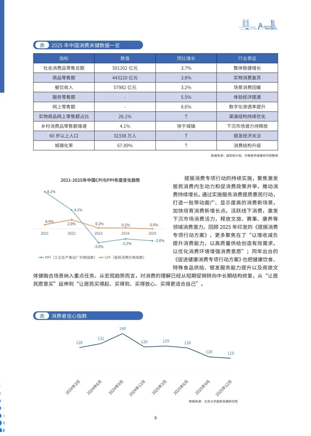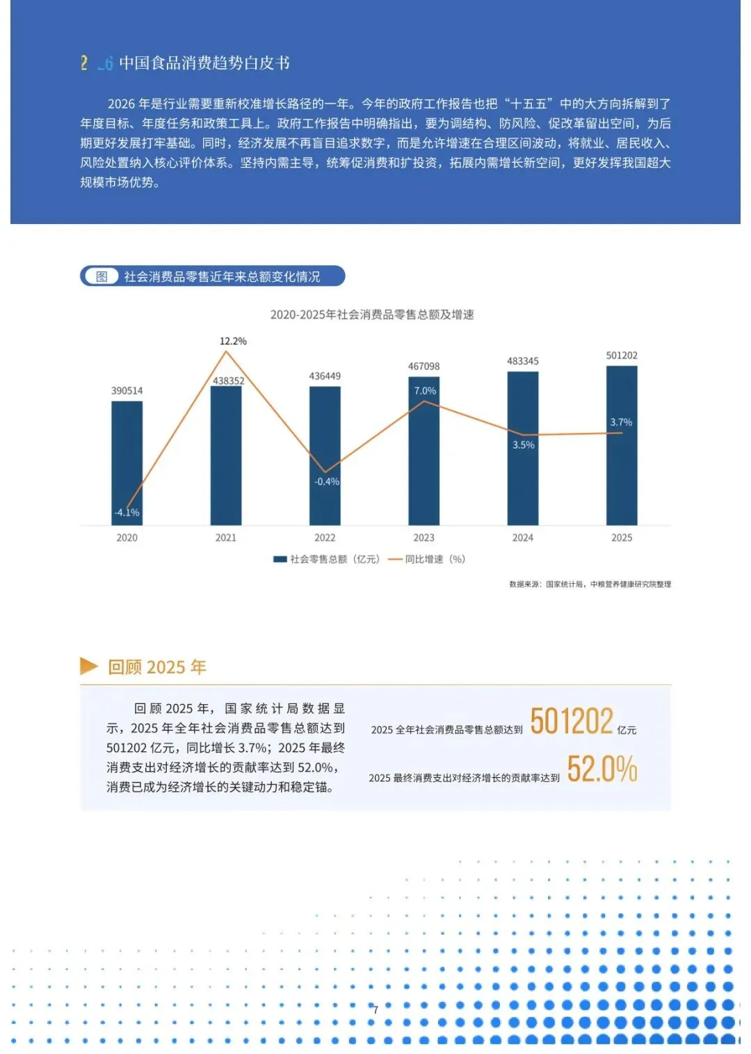 站在“十五五”开局之年,中国食品消费正从疫情后的恢复性增长,转向由内需驱动、科技赋能与品质升级共同塑造的结构性新周期。2025年,社会消费品零售总额达50.1万亿元,同比增长3.7%,消费已成为经济增长的核心动力。未来,企业竞争不再单纯依赖价格与流量,而是回归到产品质量、供应链效率、品牌信用与差异化创新等硬实力上。政策层面,无论是中央一号文件对粮食安全的强调,还是对食品安全全链条的严格监管,都为行业划定了高质量发展的底线。