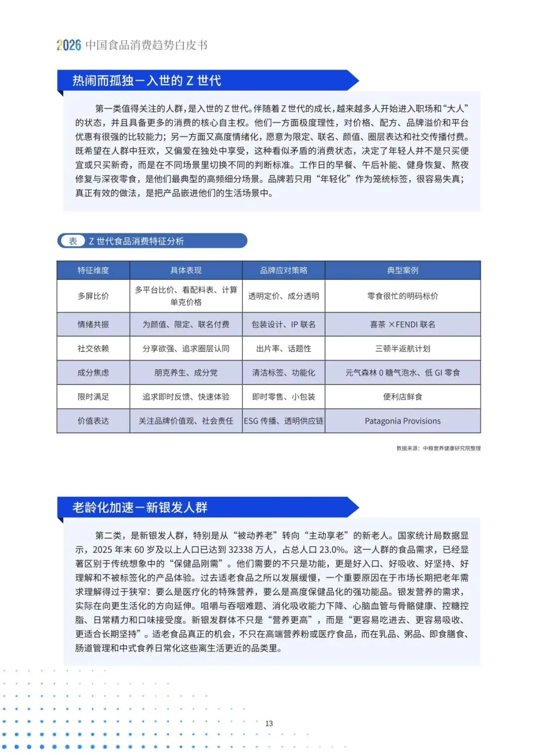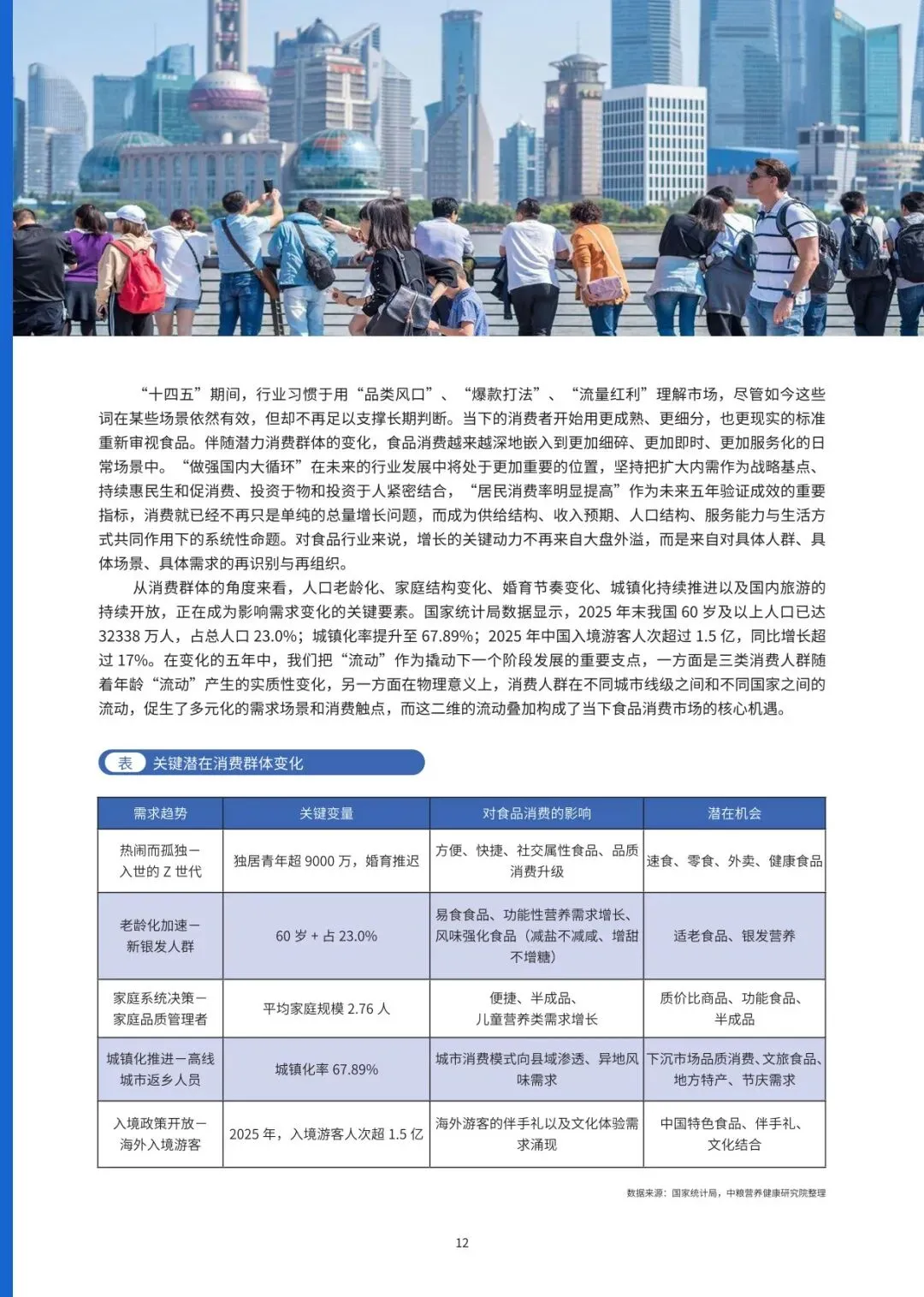 消费者的变化不再是总量的扩张,而是结构的迁移。五类潜力人群正重塑市场需求:入世的Z世代既理性比价又愿为情绪价值付费;加速老龄化的“新银发”人群需求从“被动养老”转向“主动享老”,追求易食、易吸收的日常食品;家庭品质管理者更看重采购效率与质价比,推动了会员店的发展;城镇化推进让高线城市返乡人员将品质消费需求带入县域市场;入境游的升温则让中国食品成为文化输出的新入口。食品消费正从“卖产品”转向“卖场景”。