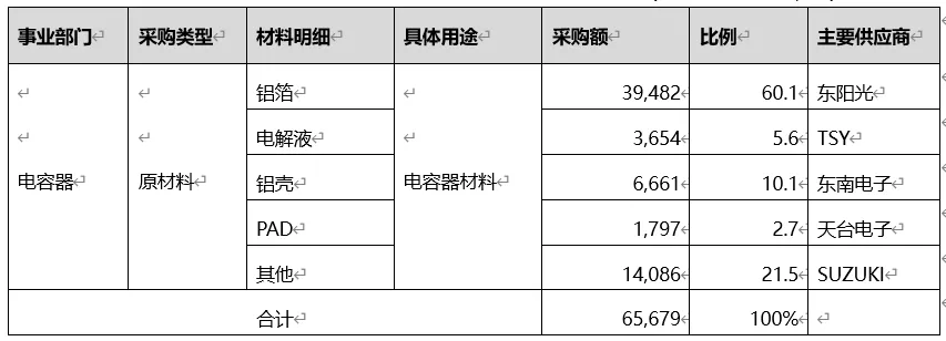 主要原材料中铝箔以采购东阳光为主,电解液来自日本东京产业洋纸,铝壳和盖板均为韩国当地供应商,其他供应商还包括日本铃木电子。其中2025年度铝箔采购金额为656.94亿韩元(约合3.01亿元人民币),按照均价31.22元/平米计算,阴极和阳极(低中高压)合计月用量大致在80.33万平米。