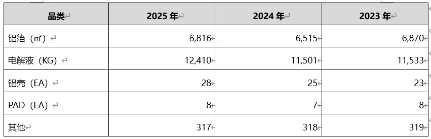 原材料采购价格方面,铝箔平均单价为6816韩元(约合31.22元人民币),较2024年平均单价6515韩元(约合28.84元人民币)相比价格小幅上涨4.6%。电解液平均单价为12410韩元(约合56.84元人民币),较2024年平均单价11501韩元(约合52.67元人民币)相比价格上涨7.9%。铝壳平均单价为28韩元(约合0.13元人民币),较2024年平均单价25韩元(约合0.11元人民币)相比价格上涨12%。PAD平均单价为8韩元(约合0.04元人民币),较2024年平均单价7韩元(约合0.03元人民币)相比价格上涨14.3%。