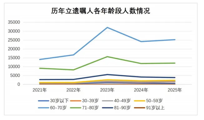 白皮书有200多页,很多内容与数据,值得研究。比如,来立遗嘱的人群中,60-70岁最多,71-80岁次之,其它年龄段相对较少。年轻时,在工作,想不到遗嘱这事。60岁退休,立马空下来了,想的也就多了。