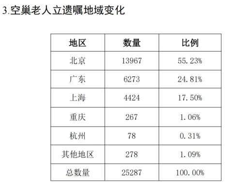 空巢老人,立遗嘱地域,一半在北京。这不是说北京人对遗嘱更重视,而是因为这个遗嘱库的服务点,在北京最多。其它地方,未来需要更多发展。