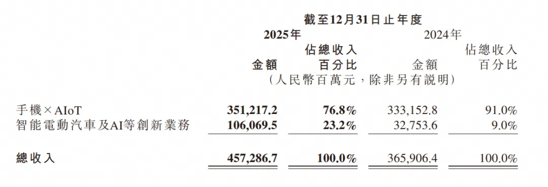 2025年,小米智能电动汽车及AI等创新业务分部全年收入首次突破千亿大关,达1060.70亿元,同比增长223.8%,占总营收的比重从2024年的9%提升至23.2%。企业全年交付超41万辆新车,交付量同比增长200.4%。