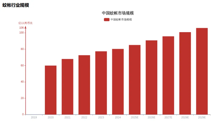 2020-2024年,中国蚊帐行业规模从59.93亿元增至80.29亿元(年复合增长率7.59%),高端、功能性产品领跑;未来依托睡眠经济,预计2029年规模破105.93亿元,环保智能、功能性产品为增长核心。