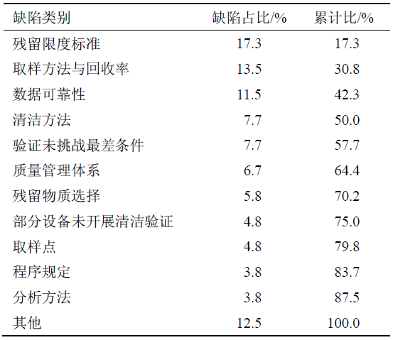 对于存在多产品共线生产的企业,现场检查的重点必然包括清洁验证。通过对国家核查中心2017-2018年跟踪检查中发现的缺陷进行统计分析,发现涉及清洁验证的缺陷共78条,主要问题及分布情况见表1。