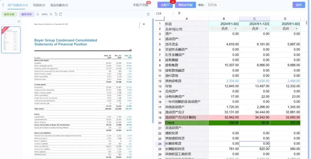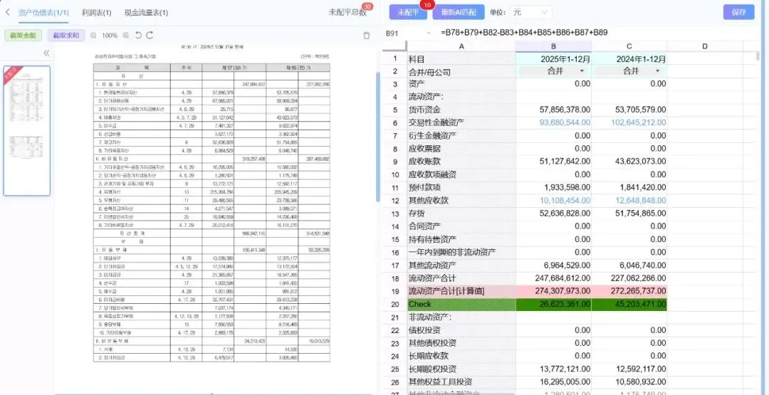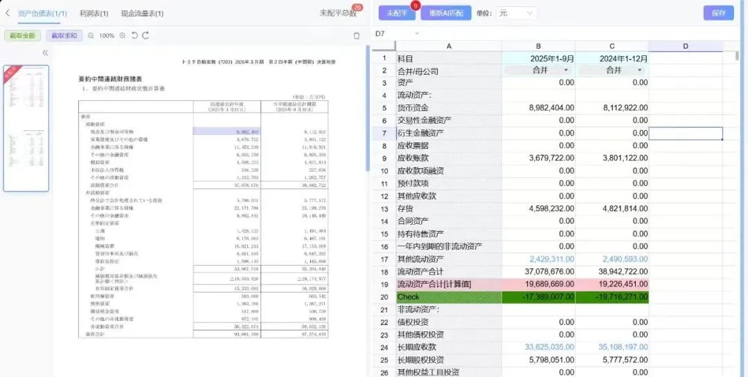 系统自动找到三大报表、自动进行报表类别划分、自动进行报表合并(分布在多页中的同一类型报表,无需手工合并),对于各种扭曲的图片也能精确处理,鲁棒性极强!