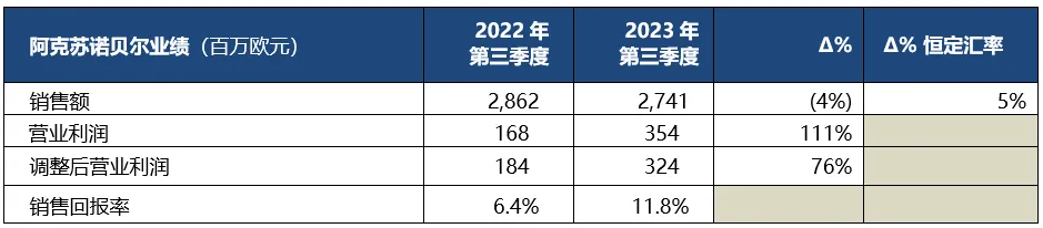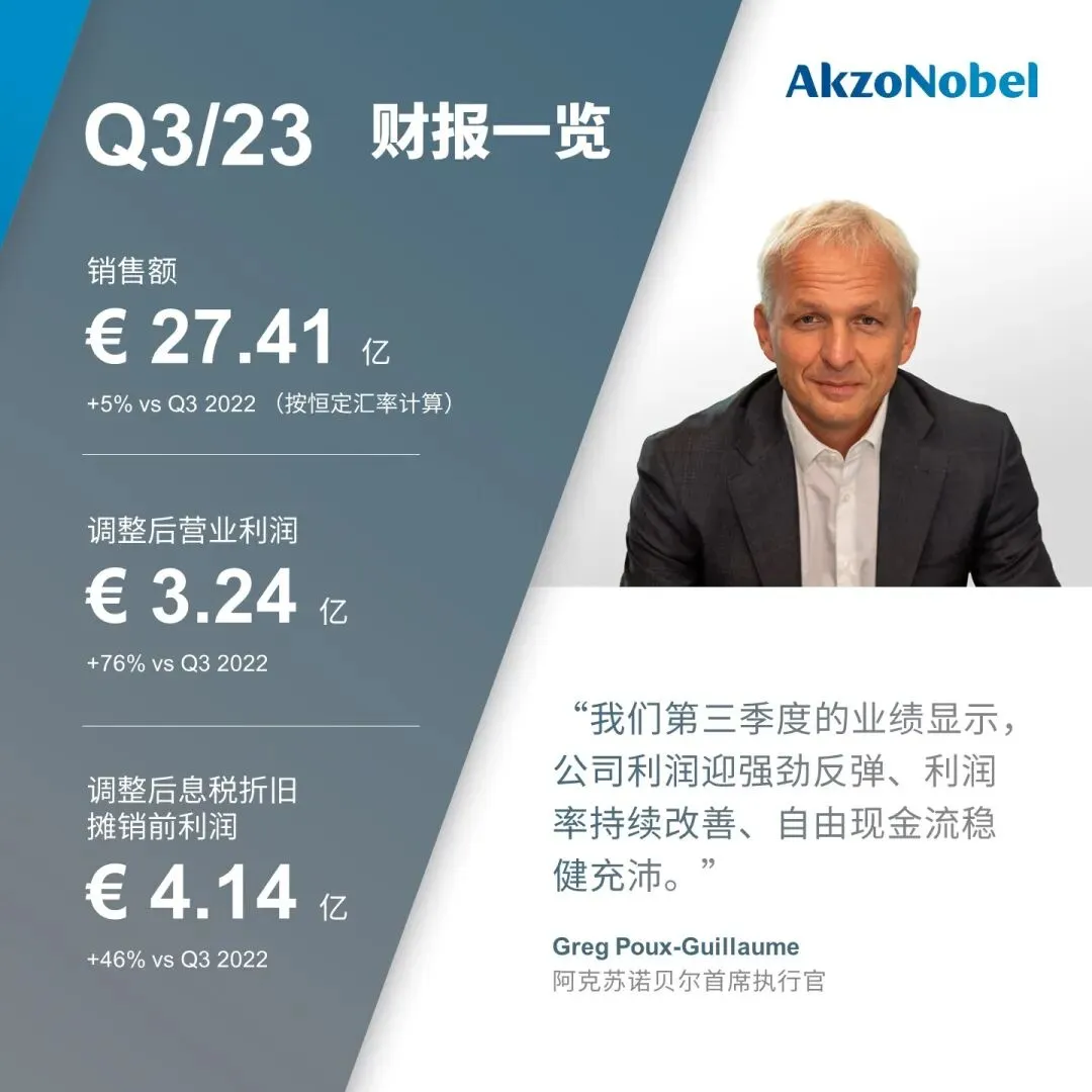 阿克苏诺贝尔2023年第三季度业绩持续回暖,利润稳步增长,自由现金流强劲。