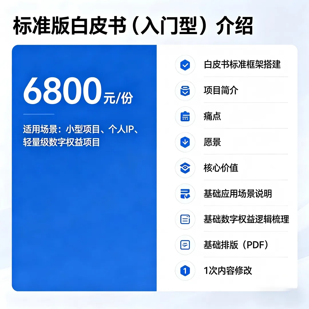 结合市场需求与项目规模,我们推出四大梯度版本,从入门到定制,全方位覆盖各类主体的白皮书需求,兼顾性价比与专业性: