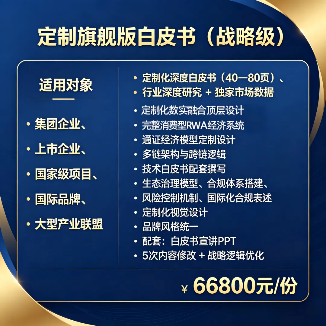 核心服务:40–80页战略级深度内容,涵盖全套经济模型设计、消费型RWA全链路逻辑、数字资产生态闭环、多跨场景融合方案、合规框架与法务表述,配套商业计划书简版与PPT大纲,专属视觉升级,无限次修改至定稿,可直接用于融资、招标、政府申报、品牌发布。
