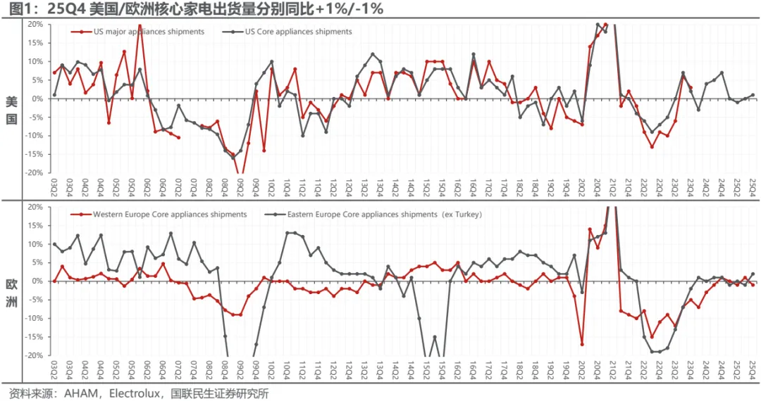 我们系统跟踪的15家海外公司中,25Q4当季6家收入增长提速,2家环比基本平稳,其余7家降速。分品类,当季欧美市场出货平稳为主,延续前三季度趋势,大家电龙头增长平稳偏弱,Whirlpool及Electrolux均降速,日韩系平稳;小家电龙头α突出,平淡需求环境中持续双位数增长;HVAC家商用表现分化,美国家用市场出货仍受渠道去库影响,仍在筑底,Carrier及Lennox受此拖累,均连续2个季度下滑,商用数据中心等赛道景气向上,驱动龙头Applied业务接单翻倍以上增长,但项目周期较长,短期转化有限,Trane、JCI收入稳健增长。