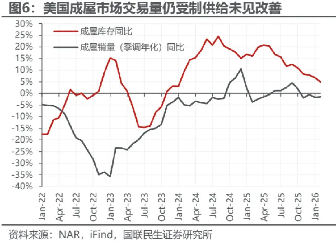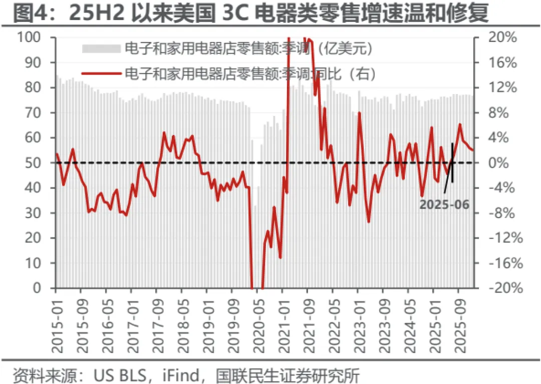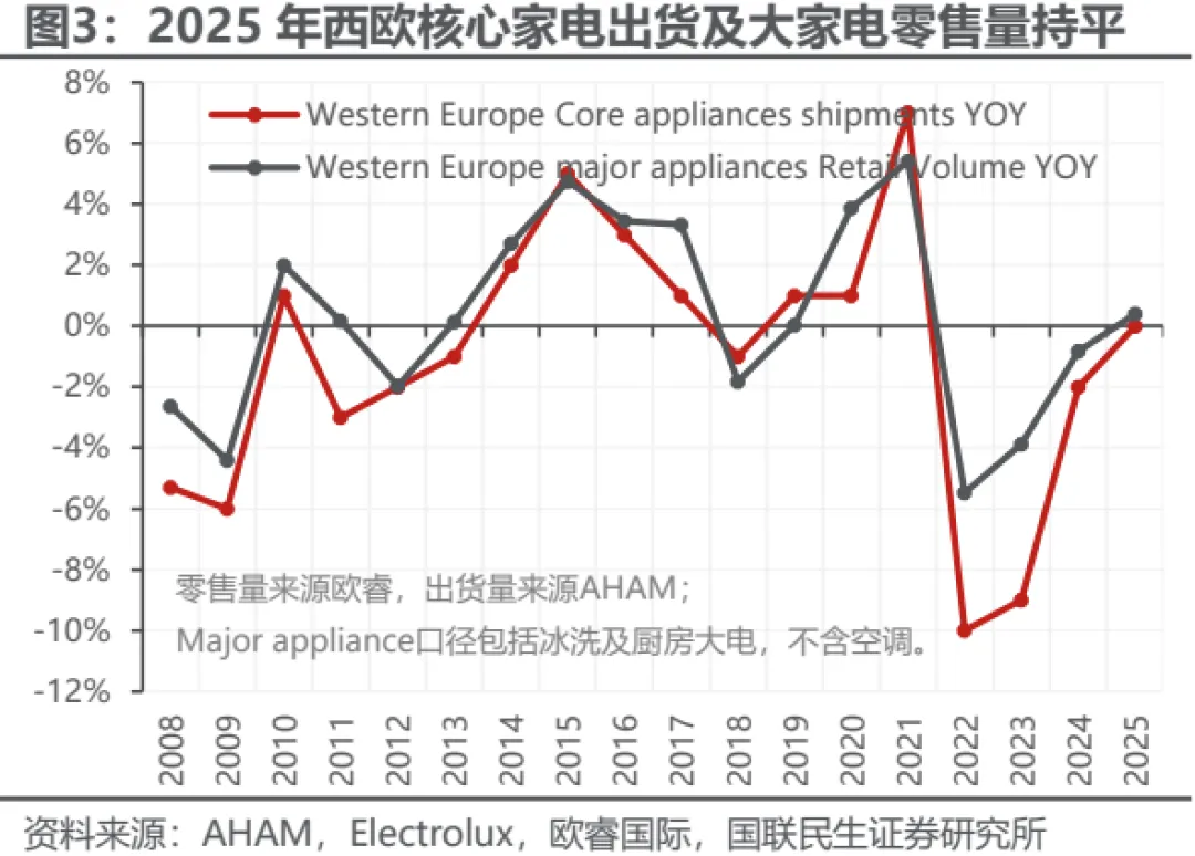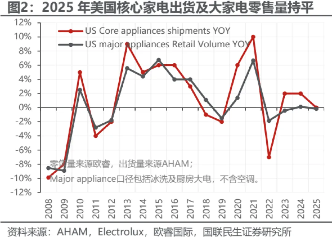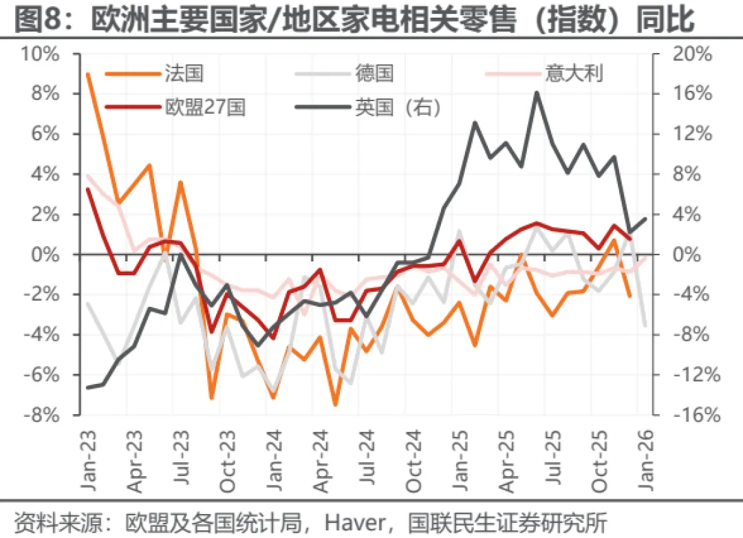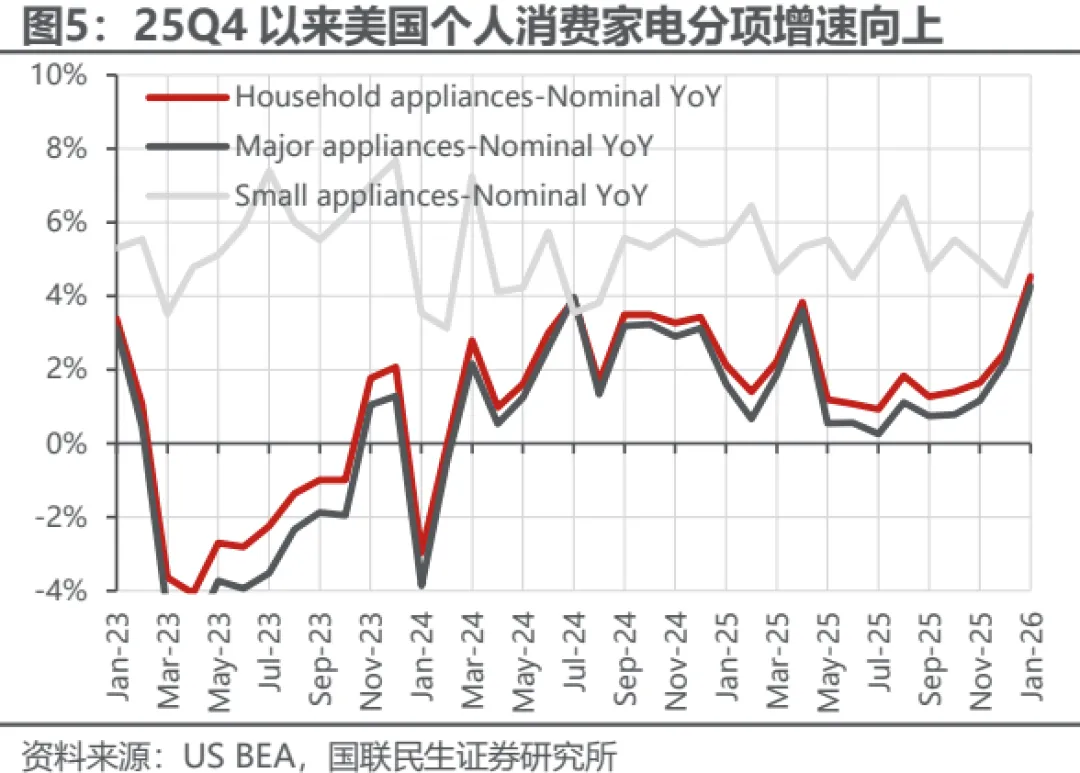 美国市场,地产交易量低迷的压制未有减轻迹象,利率锁定效应影响下,成屋供给依然受限,可负担性尚未明显改善,至2026年初,成屋及新屋整体成交量仍在460~480万套的低位徘徊,距600万套以上的历史中枢仍有20%以上缺口,环比来看,成屋库存与成交趋势也未有二阶拐点显现。与此同时,地产销量规模中枢下行已三年有余,边际拖累减轻,叠加房贷利率下行后存量贷款再融资带来的现金流改善,家电相关零售/消费景气自25H2以来缓步修复:电子和家用电器类商店零售额同比自2025年6月转正,此后保持中低个位数平稳增长,好于此前0%左右中枢;消费端,个人支出中的家电相关分项自25Q4环比改善,2026年1月家电支出名义同比+5%,实际同比+2%。整体来看,趋势好转,但难言弹性。