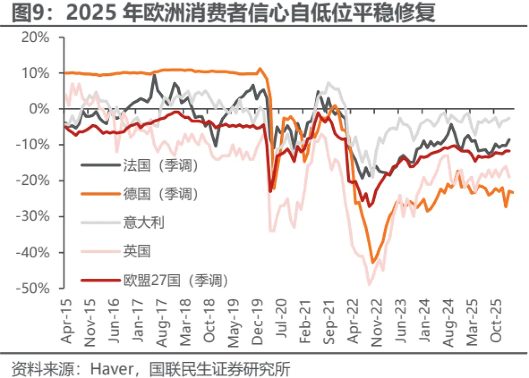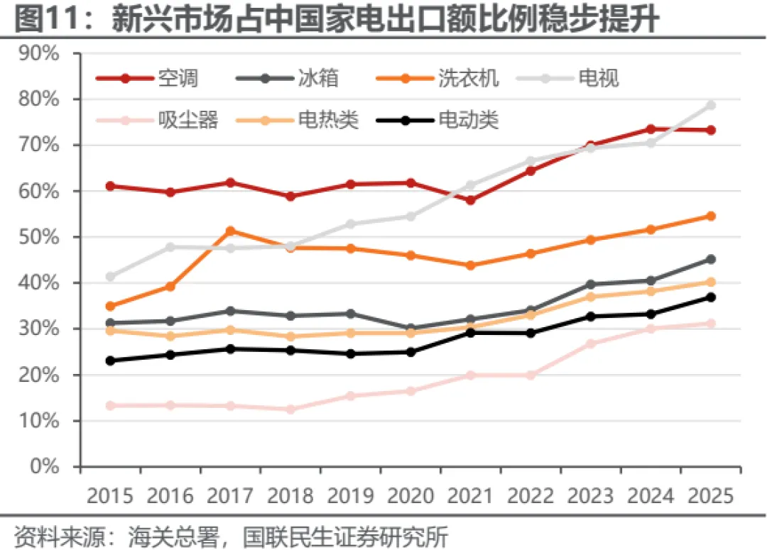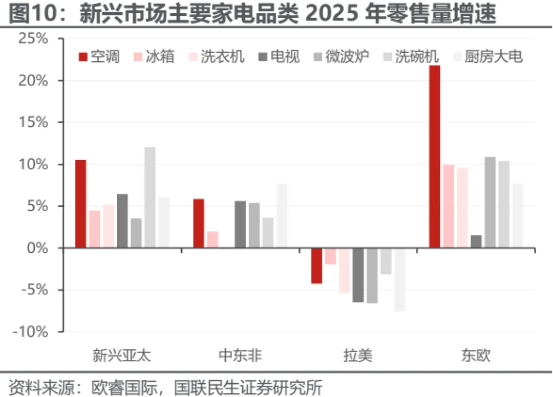 此外,欧洲主要国家2025年家电相关零售同样在低位修复进程中,弱于美国,欧盟27国整体家电家居零售额指数同比自25Q2以来在0%~2%区间内保持平稳,英国增长趋势相对较强,其余核心国家分化不大,消费者情绪指标趋势相近,走平为主。新兴市场方面,主要区域2025年核心家电零售规模增速由高至低依序为:东欧(~+10%)>新兴亚太(+5%)>中东非(0%~5%)>拉美(~-5%),景气分化,但关税不确定性驱动的市场转移和转口趋势下,新兴作为中国家电出口目的地的重要性持续提升,2025年除空调高位平稳外,新兴市场在冰箱(+5pct)、洗衣机(+3pct)及电视(+8pct)出口额中的占比均有提升。