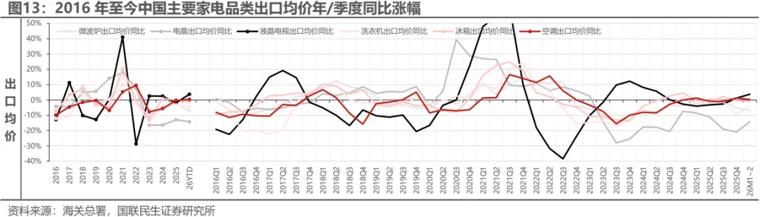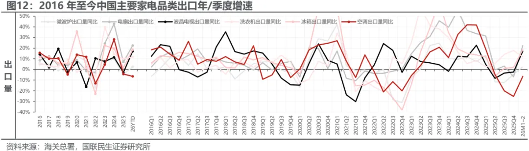 2026年1~2月海关口径下中国家用电器出口量同比+16%,人民币/美元额分别同比+9%/+11%,环比提速;分品类,1~2月空调/冰箱/洗衣机/液晶电视出口量分别同比-7%/+19%/+12%/+17%,主要小电中吸尘器及电扇均有双位数增长,除空调仍受高基数影响表现偏弱,多数品类均已恢复至景气区间。回顾25Q4,空调、电视及多数小电在高基数、消化前期抢出口影响下仍在筑底,冰洗α突出,冰箱增速自25Q3回正,洗衣机回升至双位数增长,2025全年品类间分化明显。