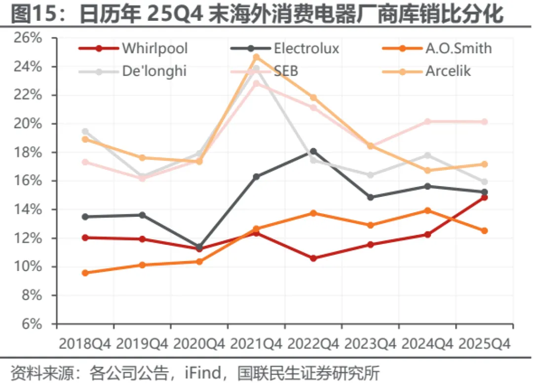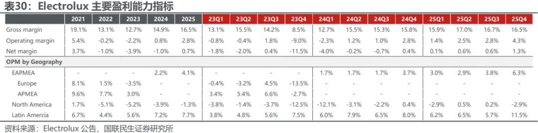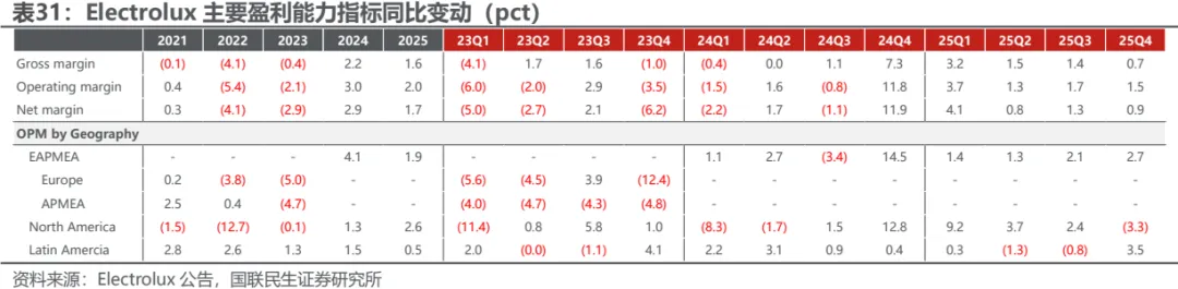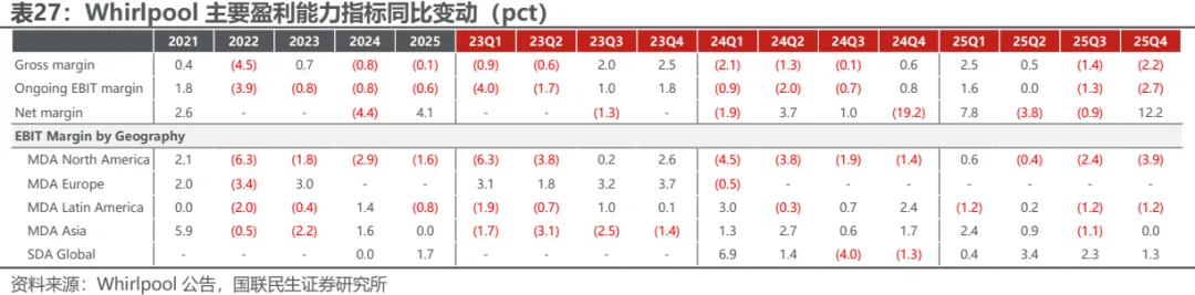 当季营收在25Q3同比回正后再度转负,经营低预期。分地区,剔除汇率当季大家电北美收入同比-1%(25Q3为+3%),拉美同比-5%(25Q3为-6%),小家电全球同比+8%(25Q3为+10%),北美是当季主要拖累项,主因需求持续疲弱,而市场库存水位及促销竞争烈度超预期。25全年,大家电北美占营收65%,大家电拉美占21%,小家电占7%。分产品,25Q4洗衣机收入同比+2%,冰箱同比-3%,烹饪电器同比+1%,洗碗机同比+2%,其中冰洗小幅改善,厨电环比降速。