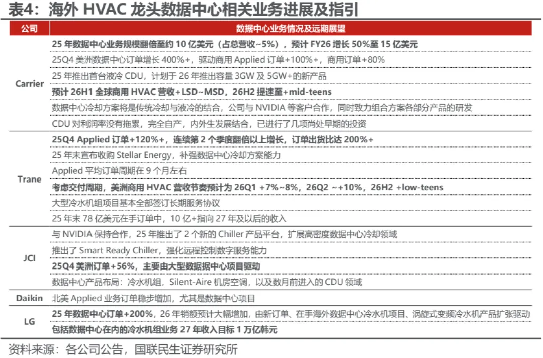 数据中心订单强劲,美国空调拐点渐近。结合当季业绩、订单及公司预期,本财季海外龙头财报亮点在HVAC的两个改善逻辑:其一,数据中心冷却放量,龙头Carrier及Trane当季美洲Applied(工商业大型HVAC项目)订单均翻倍增长,其中Carrier数据中心订单+400%+,部分厂商亚洲亦有不俗表现,25年LG数据中心订单+200%,CY25Q4 JCI亚洲Applied提速;后续,Carrier预计26年数据中心收入+50%至15亿美元,LG目标27年冷水机组收入1万亿韩元。其二,美国家用空调市场自25年初起新产品制冷剂切换,前期渠道囤积旧冷媒产品导致高基数及累库,时至25年末,龙头Lennox直销渠道库存去化基本完成,Carrier美洲家用渠道库存同比降幅在30%以上,去化显著,后续家用业务大概率筑底改善。