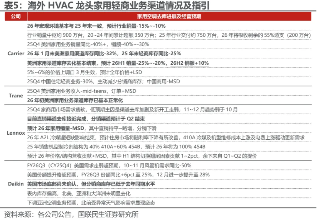 当季公司收入同比-11%(25Q3为-5%),美国家用渠道去库加剧,降幅扩大;25全年收入-3%,Q3指引为-1%,渠道去库及新房开工走弱加剧,经营低预期。公司业务美国家用HVAC敞口较高,25全年家用收入占比64%,美国占比93%,受行业库存周期影响较大,25Q4当季家用收入同比-21%(25Q3为-12%),持续走弱;商用收入同比+8%,环比Q3略有降速;分量价,当季销量同比-23%,价格/结构同比+9%,对冲出货疲弱。年末公司直销渠道去库接近完成,分销渠道预计于26Q2末完成,库存周期或已筑底,消化Q1高基数后,有望回归增长。