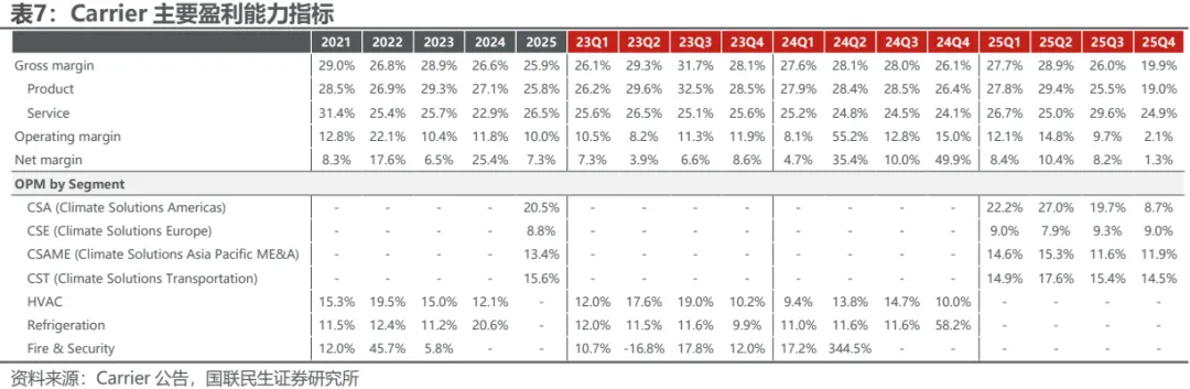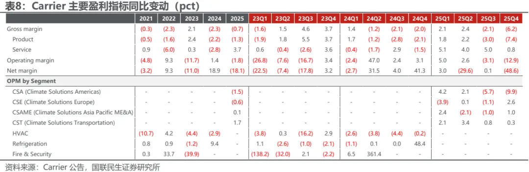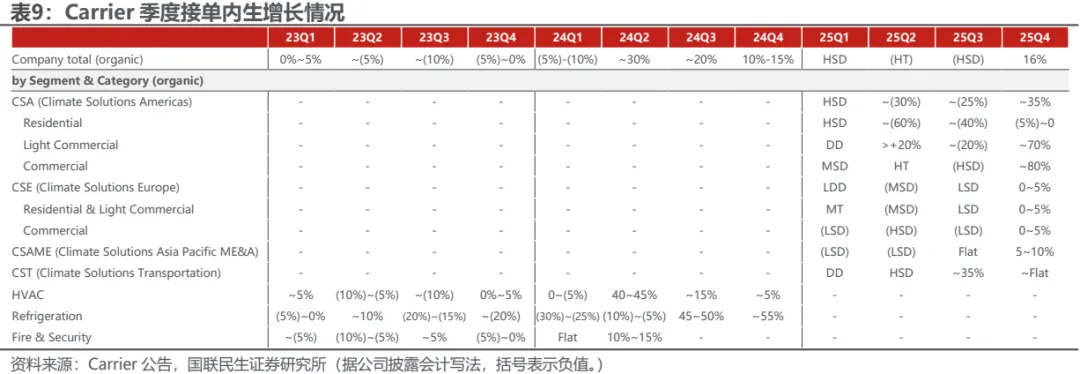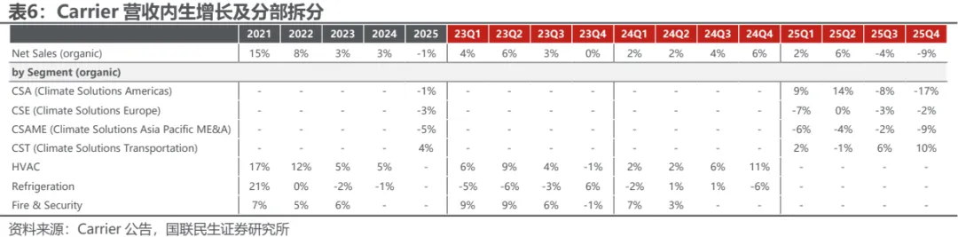 Carrier:25Q4收入内生同比-9%,26年预期持平~低个位数增长