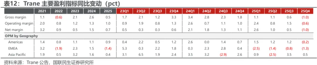 25Q4公司经营利润率同比-13pct至2.1%,毛利率同比-6pct至20%;分部来看,美洲HVAC经营利润率同比-10pct至9%,同步收入走弱,连续第2个季度同比下降,同步收入端趋势;欧洲/亚太中东非经营利润率分别同比+3/+1pct,均有改善。公司预计26年经调经营利润率约15.5%,小幅改善;25全年实际为15.1%,处于25Q3末全年指引下界附近。