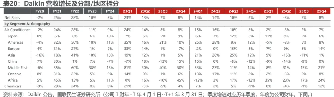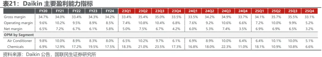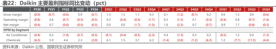 历年25Q4对应公司财年FY25Q3,公司当季收入同比+8%,连续2个季度提速;其中,空调收入同比+7%,回归稳健,化学同比+12%,受半导体等下游需求改善驱动。主业空调分地区,当季美洲收入同比+8%,欧洲+14%,均连续2个季度提速,日本本土收入+6%,中国及亚洲其他国家基数走低,同比由下滑转为微增,大洋洲提速至+8%,环比普遍改善。其中,FY25Q1~Q3占空调收入41%的美洲经营表现抢眼,期间行业需求下行幅度超预期,公司始于季度初的“win-back”份额收复计划取得显著成效,当季份额同比+6pct至25%,12月恢复至28%。此外,中东需求景气、数据中心制冷扩张及环保冷媒渗透等因素驱动下,当季EMEA增长表现较好。后续,公司判断美国市场仍在筑底,但库存已显著去化,而亚洲前期自然灾害影响消除,有望改善。