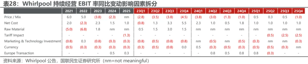 此外,公司近年来以聚焦核心主业/地区为主线的业务重组进程延续,24年4月完成欧洲大家电业务出表,与Arçelik成立合资公司Beko Corp,Whirlpool持股25%,此前已将中东及北非业务出售给Arçelik;24年2月及25年11月分步将印度子公司持股比例由75%减至约40%,并将于26年内进一步降至20%。