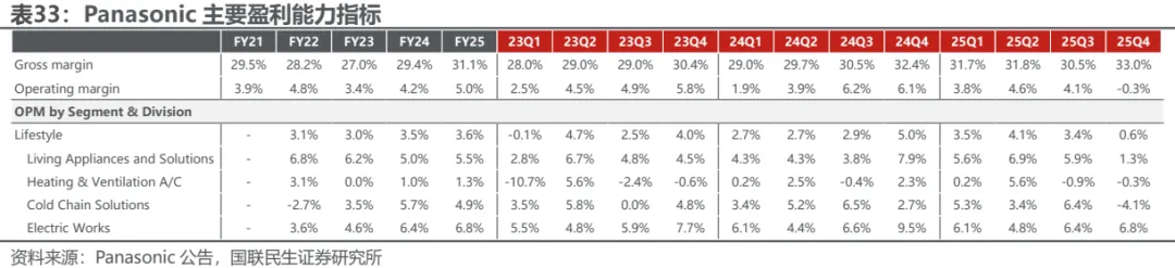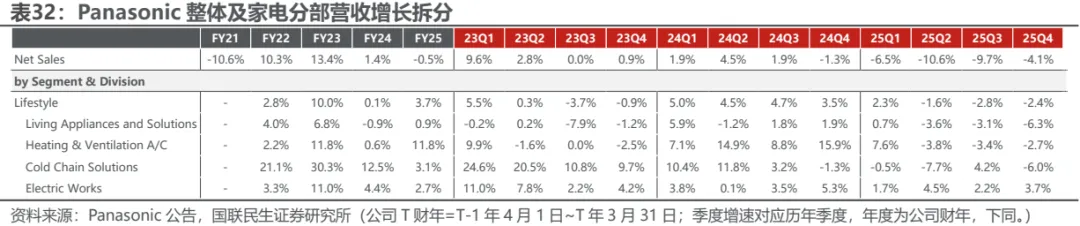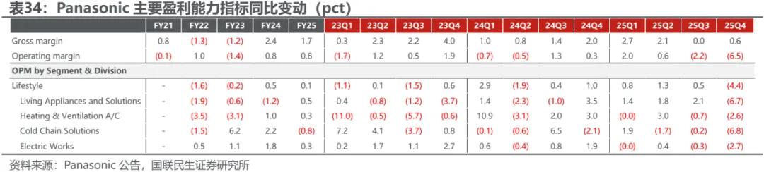 历年25Q4对应公司财年26Q3,当季公司将FY26全年家电业务收入预期下调约1.5%至3.48万亿日元,较25财年-2.3%,前一财季预期为-0.8%;因重组开支,下调FY26家电业务经营利润8.3%至880亿日元,较25财年-31%,对应经营利润率2.5%,剔除重组影响后经调利润率预期4.8%,较25财年+1pct。