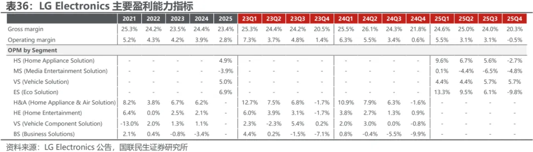 当季公司家电分部(Home Appliance,不含电视)收入同比+5%(25Q3为+5%);包含电视的媒体娱乐(Media Entertainment)收入同比-3%,年内持续下滑;空调为主体的生态解决方案(Eco Solution)收入同比-6%,持续走弱。整体来看,空调/黑电承压,消费电器平稳,主要受美国关税、通胀及地缘不确定性下消费信心复苏迟缓、竞争加剧影响,公司继续推进品牌高低端“双轨”战略、拓展B2B/线上等渠道;26年,公司预计全球家电(冰洗小电为主的消费电器)市场需求规模持平,分区域,预计北美仍下滑,中南美/中东非/亚洲[1]增长,欧洲/独联体/中国持平;空调韩国本土仍将下滑,海外有望实现增长,得益于环保法规趋严带动高端产品销售;媒体分部销售则受冬奥会/世界杯等体育赛事提振,但经济不确定性及芯片等成本上涨驱动的提价将有压制,整体预计持平。