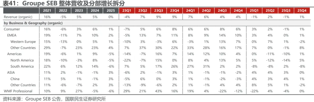 当季收入内生同比+1%(25Q3为-1%),环比小幅改善;25全年收入+0.3%,整体平稳。C端分地区,当季EMEA地区收入内生同比+1%(25Q3为持平微增),环比平稳,其中西欧降速转负,主要受德国市场低预期影响,欧洲其他及中东非+8%,是当季增长主要支撑,土耳其核心品类及线上销售表现较好,中东非受政治环境扰动;美洲收入内生同比+1%(25Q3为-10%),环比大幅改善,主因Q2~Q3零售商受关税政策变化影响而普遍产生的观望情绪减弱,渠道启动补库带动出货正常化,以及高端品牌All-Clad表现持续强劲;亚洲收入同比持平(25Q3为+3%),其中中国收入+1%,其他国家地区-2%,环比均降速。