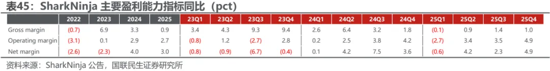 收入端,降速公司较25Q3减少,提速公司数量持平。提速的6家公司中:1)JCI主因中国业务企稳,东南亚及印度等新兴市场贡献增长,当季APAC收入同比+8%,25Q3为-3%,欧美稳健;2)Daikin增长基数压力减轻,北美渠道“win-back”计划取得成效,份额提升,营收连续2个季度提速;3)SharkNinja持续受益新品类红利及渠道、营销扩张,美容及环境电器当季收入同比+63%,食品制备电器当季+28%/提速16pct;4)Samsung(Digital Appliance)、Panasonic(Lifestyle)基数走低,小幅改善;5)Groupe SEB北美从前期关税影响中低位修复,当季+5%,25Q3为-14%。