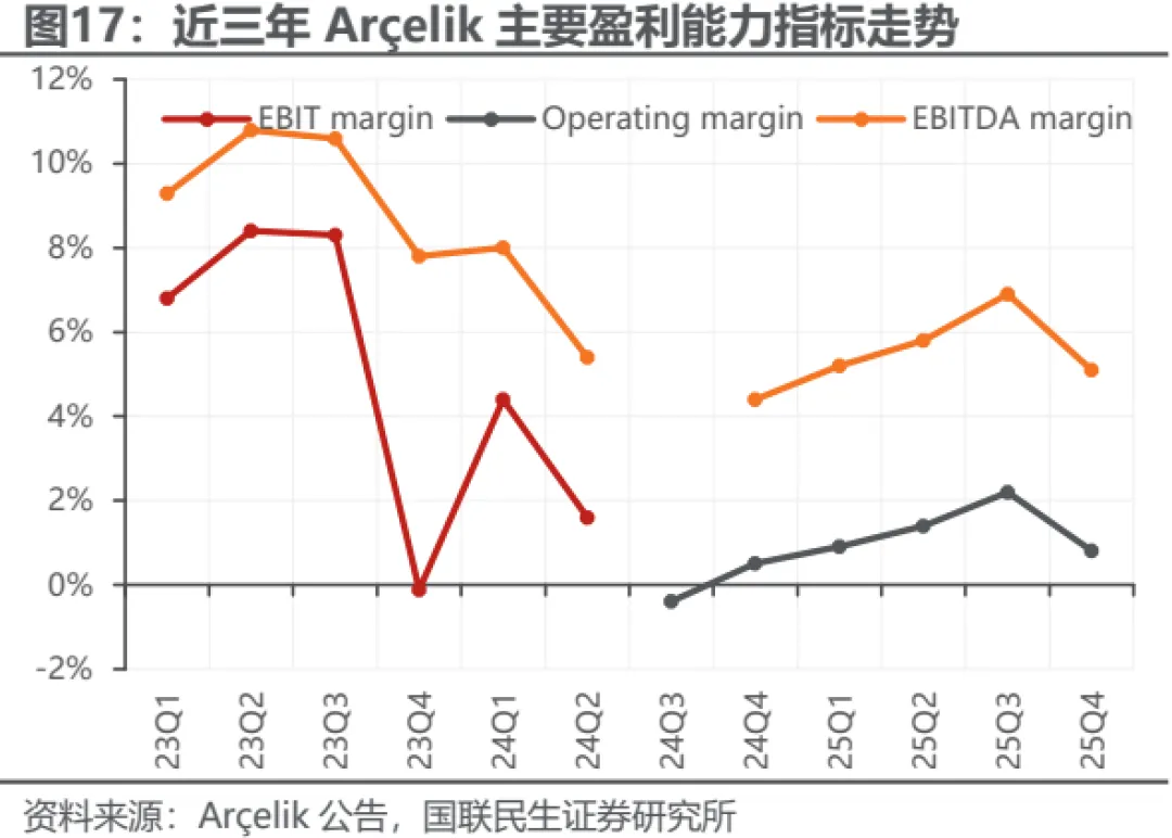 当季公司欧元口径剔除汇率收入同比-9%(25Q3为-8%),连续第3个季度负增,25全年-5%,经营低预期。拆分收入同比影响因素,当季欧洲为主的海外业务销量影响-7%,海外价格/结构影响-2%,海外合计影响-9%,此外汇率影响-1%,海外合计影响-10%~-9%,主因欧洲市场需求疲弱、竞争加剧,英国/意大利/西班牙等市场修复,而法国/德国/奥地利等需求收缩;土耳其本土销量贡献+3%,价格/结构影响-3%,合计持平。盈利方面,当季公司经营利润率同比+0.3pct至0.8%,24Q2合并Whirlpool欧洲大家电及MENA业务以来中枢下移,25Q2以来同比小幅修复,仍在近十年低位。公司预计26年本土收入持平,国际业务本币收入低个位数增长,经调EBITDA率较25年+0.35~0.60pct至6.25%~6.50%。