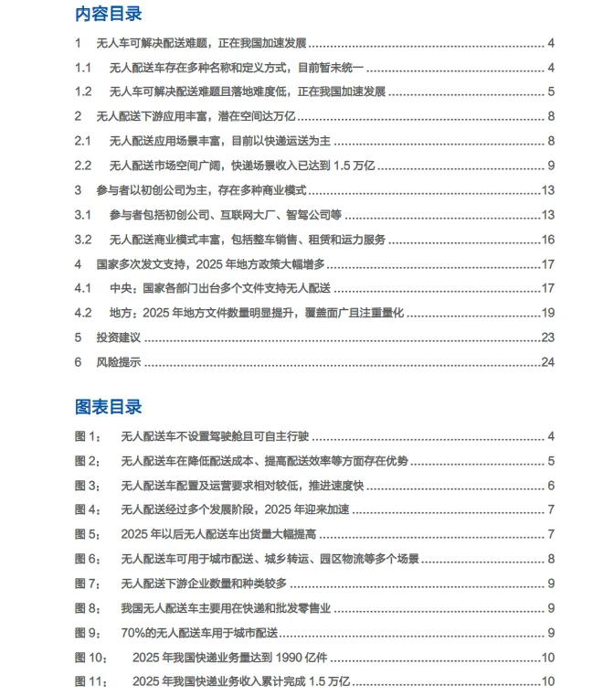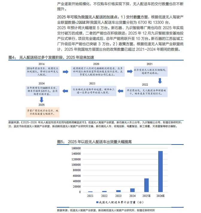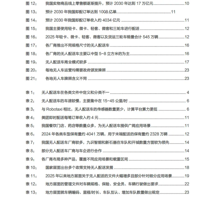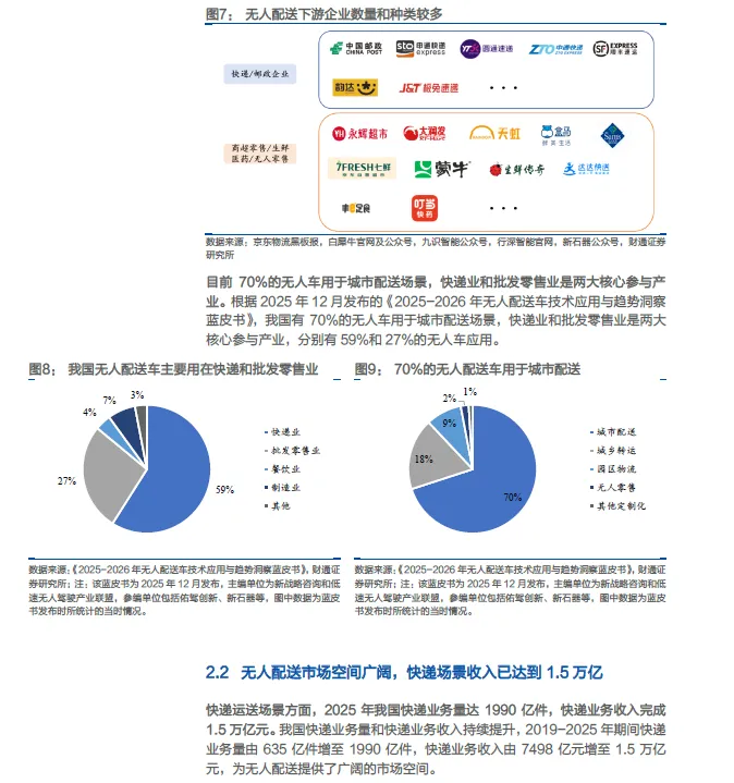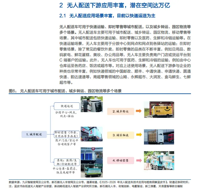 ❖ 2025年无人配送开发始展加,速下游应用场景丰富且空间大:无人配送可解决行业难题且落地难度相对较低,2025 年我国无人配送迎来加速期,主要体现在车队交付数量大幅提升和地方政策密集出台;2023-2024 年出货量分别为6700/13300 台,2025 年预计大幅增至5 万台。无人配送应用场景丰富,包括快递运输、即时零售等城市配送,以及城乡转运、园区物流等,其中2025 年仅快递场景收入便已达1.5 万亿。此外无人配送可替代的车型包括轻微卡、轻微客及货运三轮车等,2024 年预计保有量4041 万辆。
