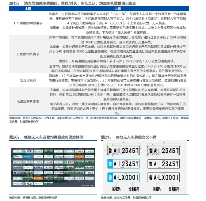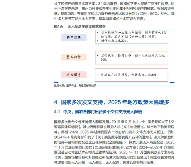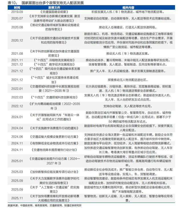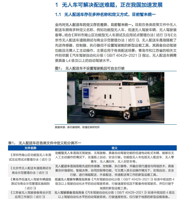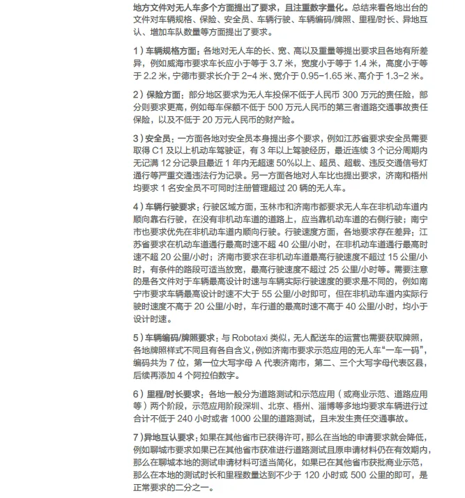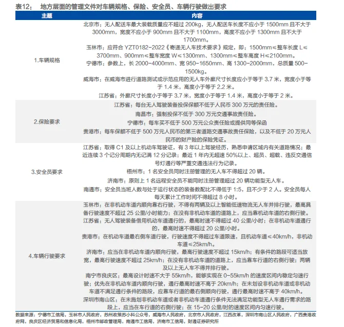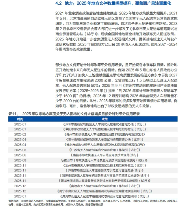 ❖ 国家多次发文支持,2025 年地方政策密集出台:国家层面,商务部、交通运输部、国务院等均发布文件支持无人配送。地方层面,据低速无人驾驶产业联盟,2025 年我国地方出台的政策数已领先2021-2024 年期间数据。2025 年以来地方政策开始针对邮政等细分应用场景且部分省市开始规划未来车队目标,例如山东目标2027 年部署1.5 万辆以上。此外,地方文件对无人车多个方面提出了量化要求,包括车辆规格、保险、安全员、车辆行驶、里程/时长等方面。