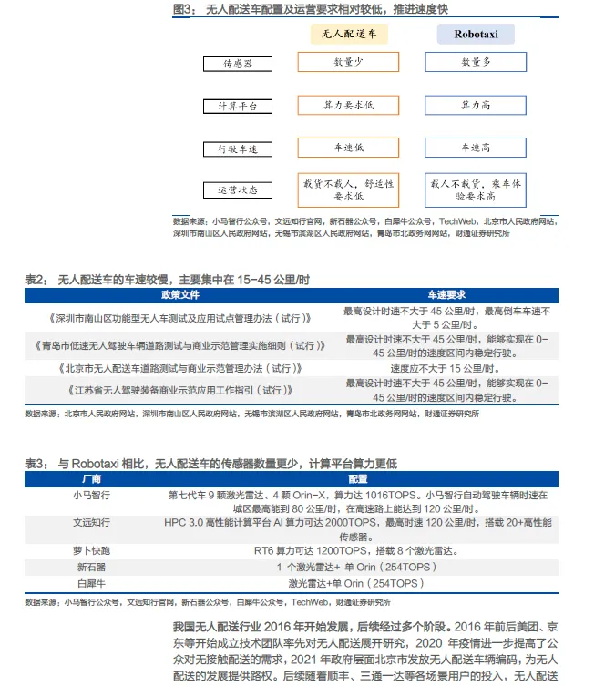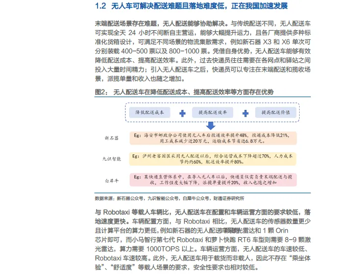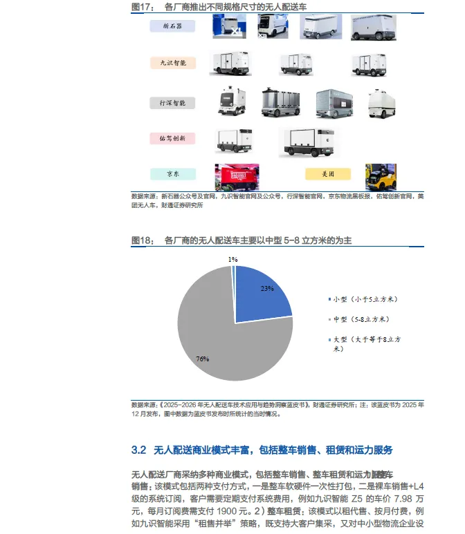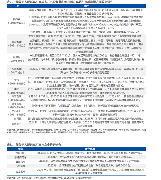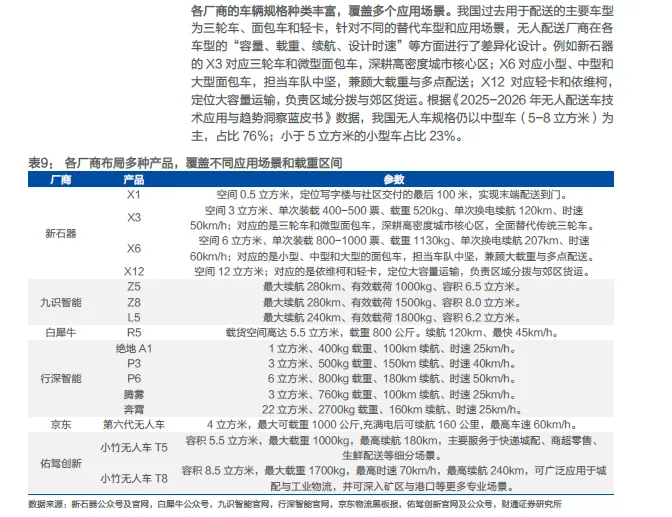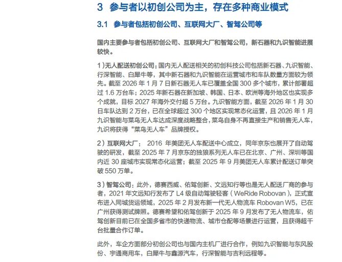 ❖ 初创公司为主要参与者,采取多种商业模式:国内无人配送参与者包括新石器、九识智能等专注无人配送的初创公司,京东、美团等互联网大厂,以及德赛西威、佑驾创新等智驾公司。其中新石器和九识智能在运营城市和车队数量方面较为领先,截至2026 年1 月7 日新石器已覆盖全国300 多个城市,累计部署超过1.6 万台车,目标2027 年海外交付超5 万台,九识智能车队则已达2 万台。各厂商往往设计不同参数规格的车型覆盖不同应用场景,且针对不同客户设有整车销售、整车租赁和运力服务等多种商业模式。