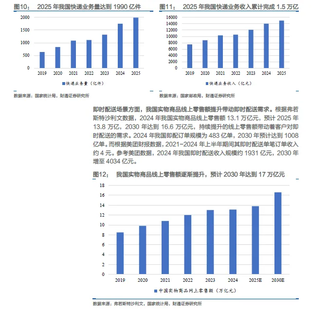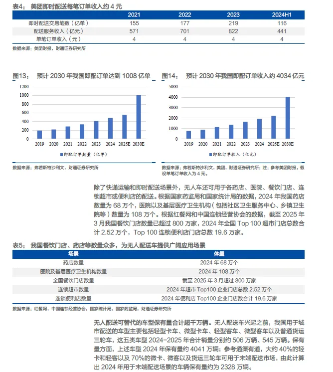 即时配送场景方面,我国实物商品线上零售额提升带动即时配送需求。根据弗若斯特沙利文数据,2024 年我国实物商品线上零售额13.1 万亿元,预计2025 年13.8 万亿,2030 年达到16.6 万亿元,持续提升的线上零售额带动着客户对即时配送的需求。2024 年我国即配订单规模为483 亿单,2030 年预计达到1008亿单。而根据美团财报数据,2021-2024 年上半年期间其即时配送单笔订单收入约4 元。参考美团数据,2024 年我国即时配送收入规模约1931 亿元,2030 年增至4034 亿元。