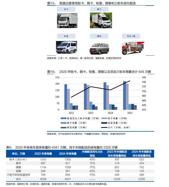 无人配送可替代的车型保有量合计超千万辆。无人配送车兴起之前,我国用于城市配送的车型主要包括轻型卡车、微型卡车、轻型客车、微型客车以及普通货运三轮车,这五类车型2024-2025 年合计销量分别约506 万辆、545 万辆。保有量方面,上述车型2024 年保有量约4041 万辆;参考通渠有道,大约40%的轻卡和轻客以及70%的微卡、微客以及货运三轮车可用于末端配送市场,由此计算出2024 年用于末端配送场景的车辆保有量约为2328 万辆。