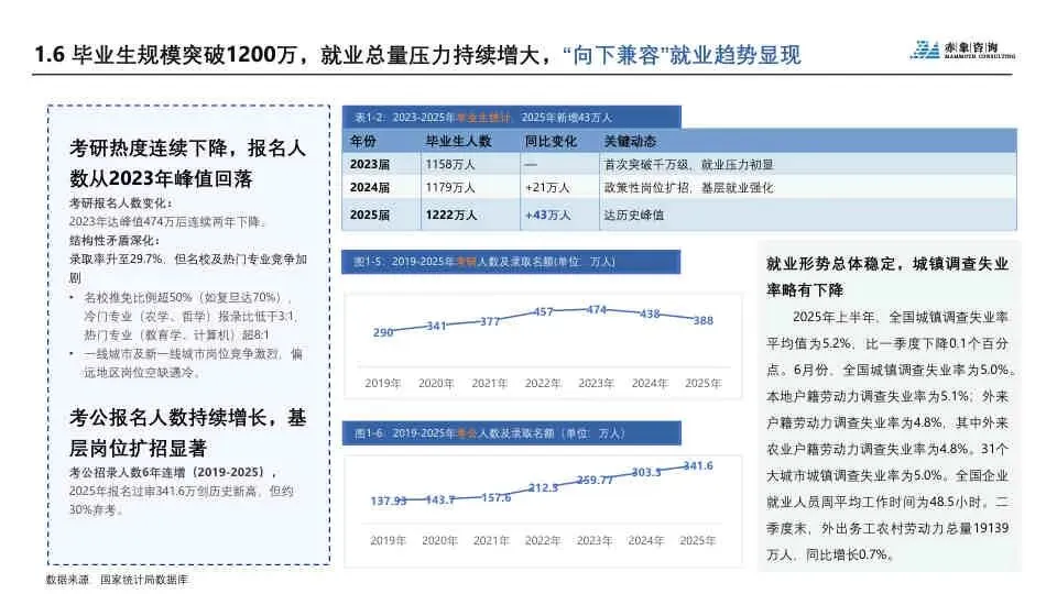 - 高危机感与谨慎流动并存: 年龄危机是首要职业焦虑来源,近六成员工考虑离职,但求职周期缩短,对异地工作意愿降低。