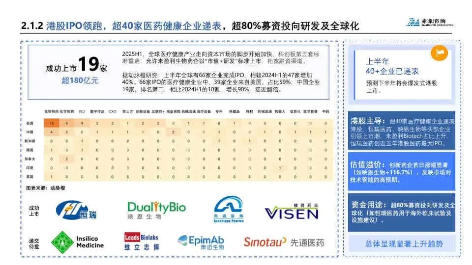 - 港股IPO领跑,超40家医药健康企业递表,募资主要用于研发及全球化。