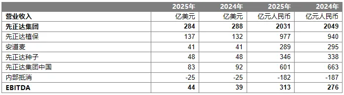 先正达集团在2025年营业收入为284亿美元,同比下降1%(按固定汇率计下降1%),其中,2025年第四季度集团营业收入为76亿美元,同比增长2%(按固定汇率计下降1%)