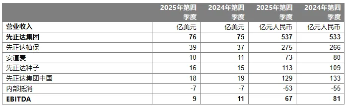 2025 年第四季度营业收入为 76 亿美元,同比增长 2%(按固定汇率计下降 1%)。植保和种子业务的增长超额抵消了安道麦和先正达集团中国的下降。2025年第四季度EBITDA同比下降16%,主要由于MAP业务重组、巴西客户信用减值准备增加,以及2024年第四季度基数较高。