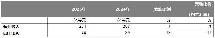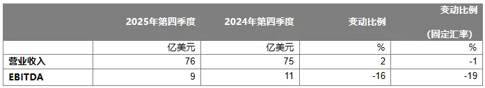 2025年集团EBITDA(息税折旧及摊销前利润)为44亿美元,同比增长13%(按固定汇率计增长17%),其中,2025年第四季度集团EBITDA为9亿美元,同比下降16%(按固定汇率计下降19%)