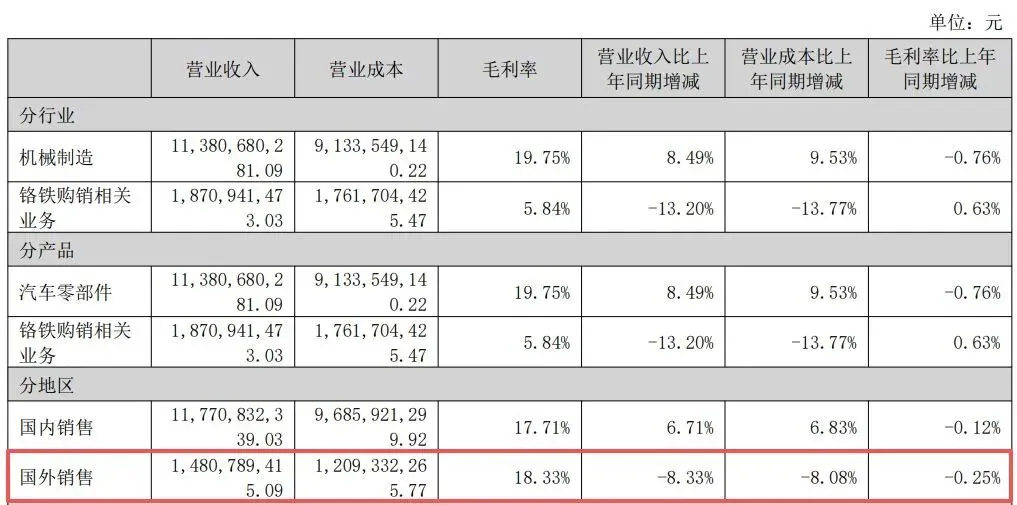 2025年公司国外营收14.81亿元,同比下滑8.33%,占总营收比重降至11.06%,主要受全球汽车需求走弱、汇率波动、国际竞争加剧影响。与此同时,机械制造主业毛利率19.75%,同比微降0.76个百分点,叠加财务费用因借款增加、汇率波动同比大增32.39%,进一步挤压盈利空间。