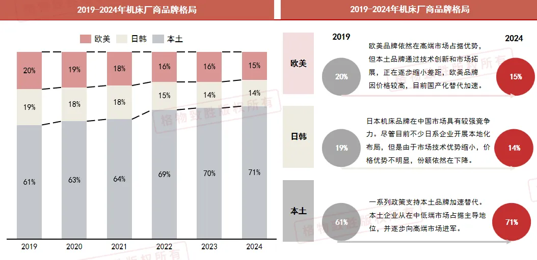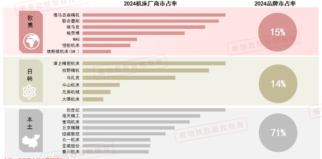 欧美日本品牌主导机床高端领域但份额在逐渐收缩,本土品牌通过价格优势和技术升级逐步进行国产化替代。