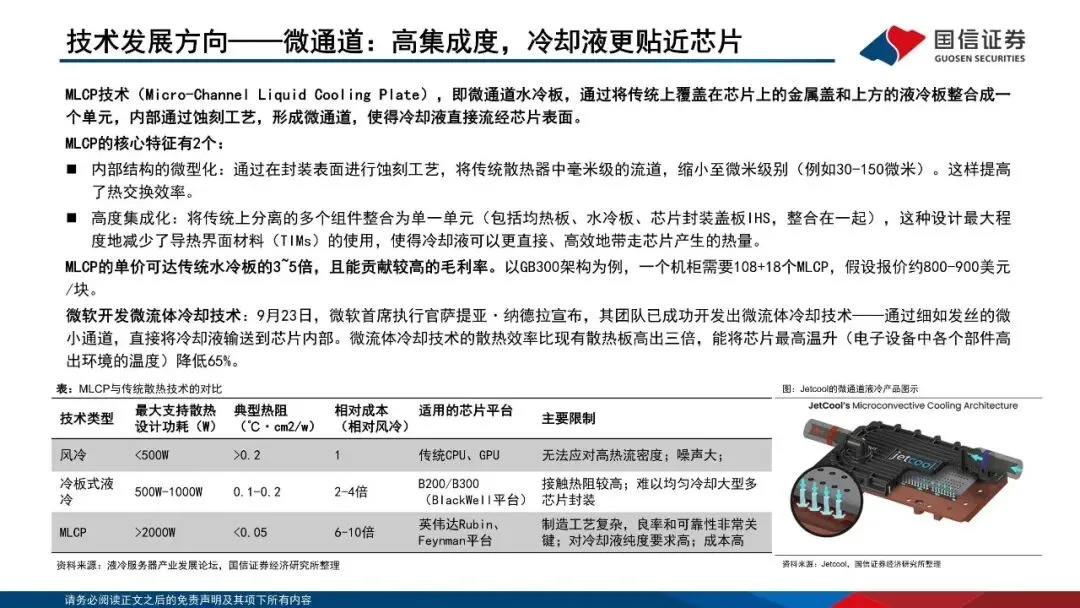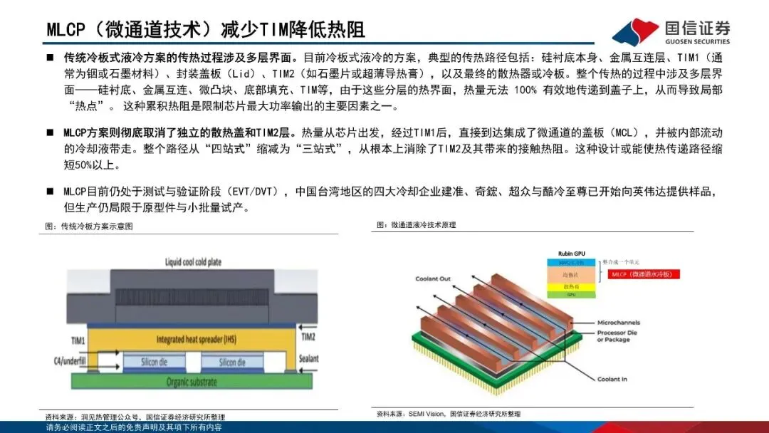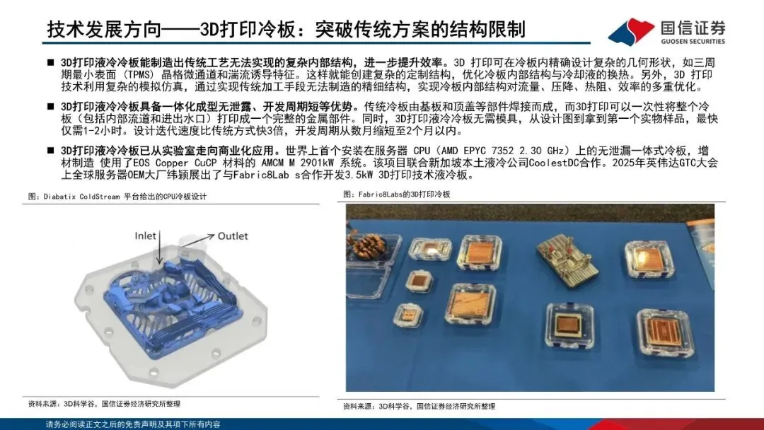技术发展方向上,微通道技术(MLCP)将传统覆盖在芯片上的金属盖和上方的液冷板整合成一个单元,内部通过蚀刻工艺,形成微通道,使得冷却液直接流经芯片表面。该方案彻底取消了独立的散热盖和TIM2层,目前仍处于测试与验证阶段;3D打印液冷冷板能制造出传统工艺无法实现的复杂内部结构,同时具备一体化成型无泄露、开发周期短等优势,3D打印液冷冷板已从实验室走向商业化应用。