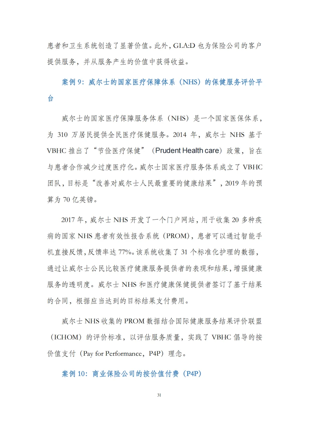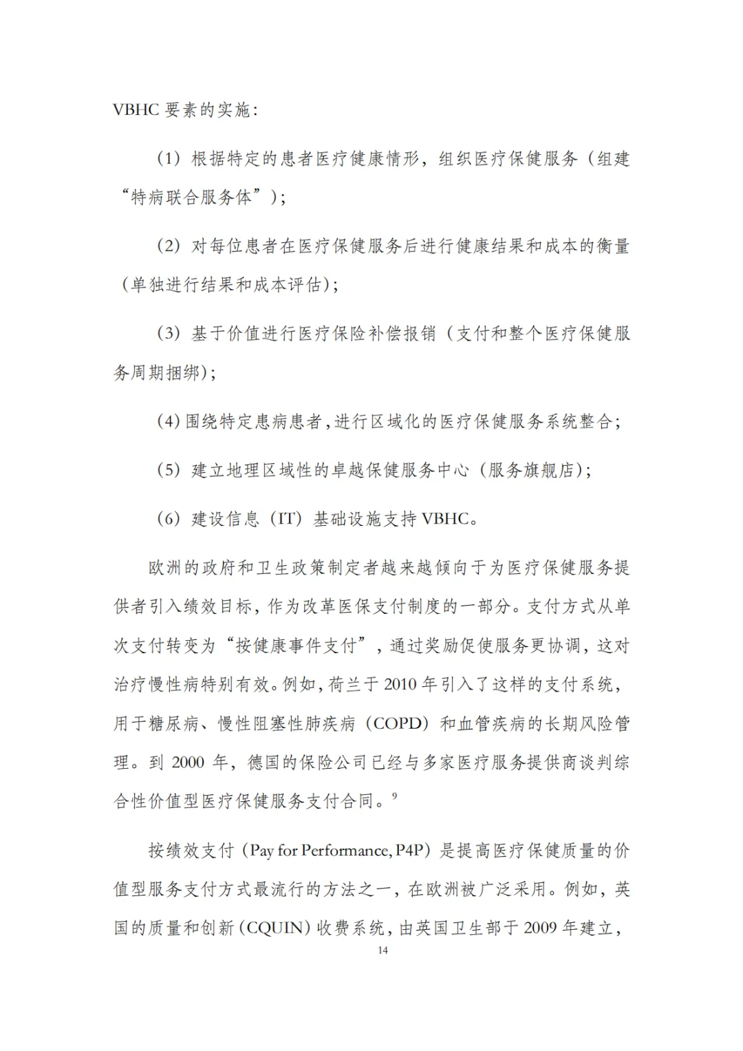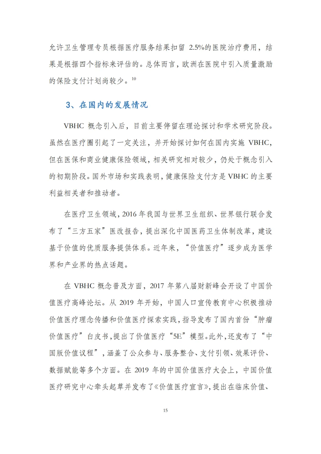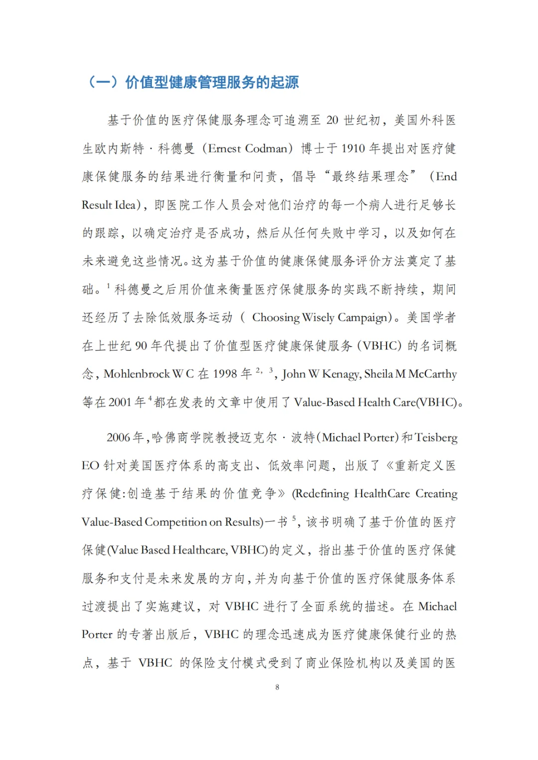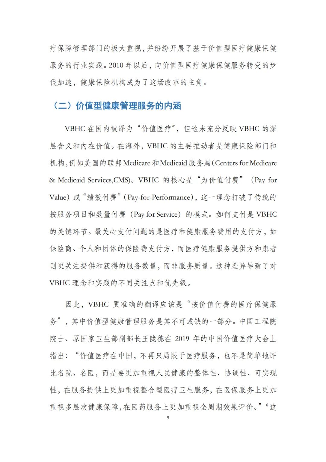 全 球视角 下,21 世 纪初价 值型健康 管理服 务(Value-based Healthcare,VBHC)理念应运而生,被认为是健康保险经营管理的核心。健康保险的健康风险管理本质就是 VBHC 倡导的为价值支付(Pay for Value)、为健康提升价值付费(Pay for Performance、P4P)、为健康结果提升付费(Pay for Result)或为健康质量改善付费(Pay for Quality)。