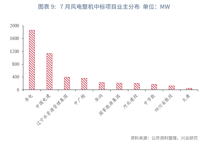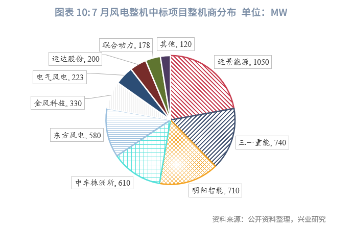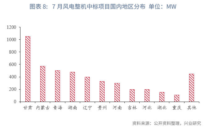 7月风电机组中标节奏加快。多个风电项目风机中标结果发布,中标规模总计4.74GW,中标项目均为陆风项目。项目分布在国内15余个地区,前三位分别是甘肃(1.05GW)、内蒙古(570MW)和青海(500MW),超过200MW的还有湖南(480MW)、辽宁(400MW)、贵州(328MW)和河南(300MW)。