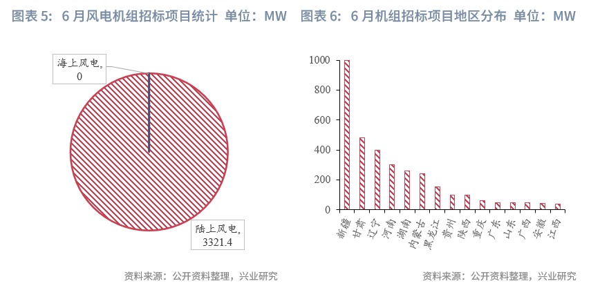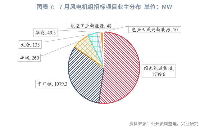 7月风电机组招标规模环比有所下降,整体较平稳。据公开资料整理,7月共有3.3GW风电项目进行机组招标,环比下降35%,全部为陆上风电项目。从地域分布来看,新疆以1000MW遥遥领先,甘肃、辽宁和河南分别以480MW、400MW、300MW位列其后,超过200MW的地区还有湖南(258MW)和内蒙古(240MW)。